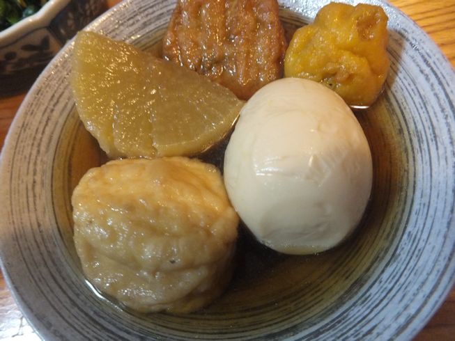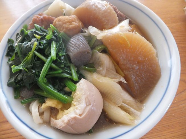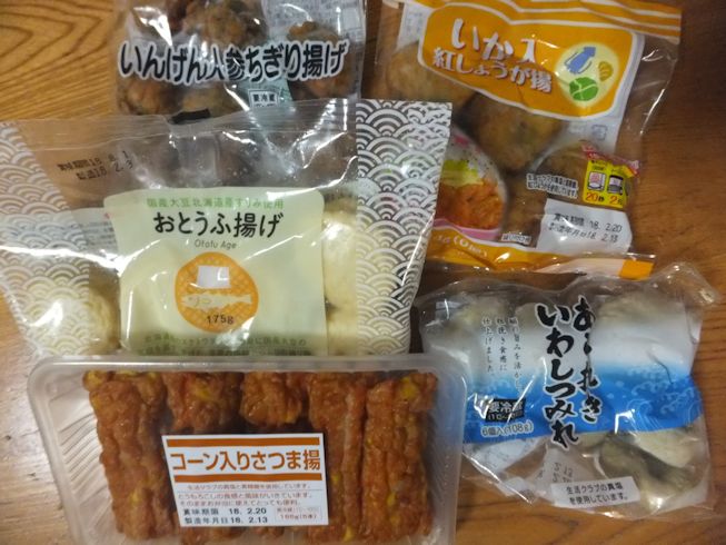 ある日のおでん。今回はいんげん人参ちぎり揚げ、いか入り紅しょうが揚げ、おとうふ揚げ、コーン入りさつま揚げ、いわしつみれかぼちゃボール揚げ大根、卵、横綱こんにゃく