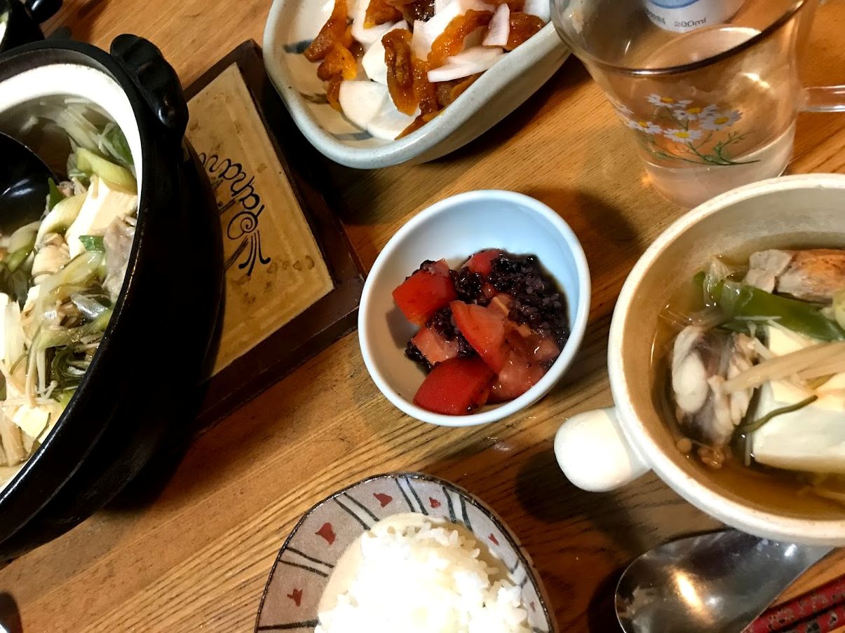 大根と干し柿の和え物、トマトと雑穀のポン酢。