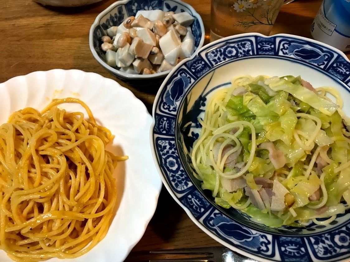 冷凍のカニのトマトクリームソースと、ベーコンキャベツのにんにく炒め。