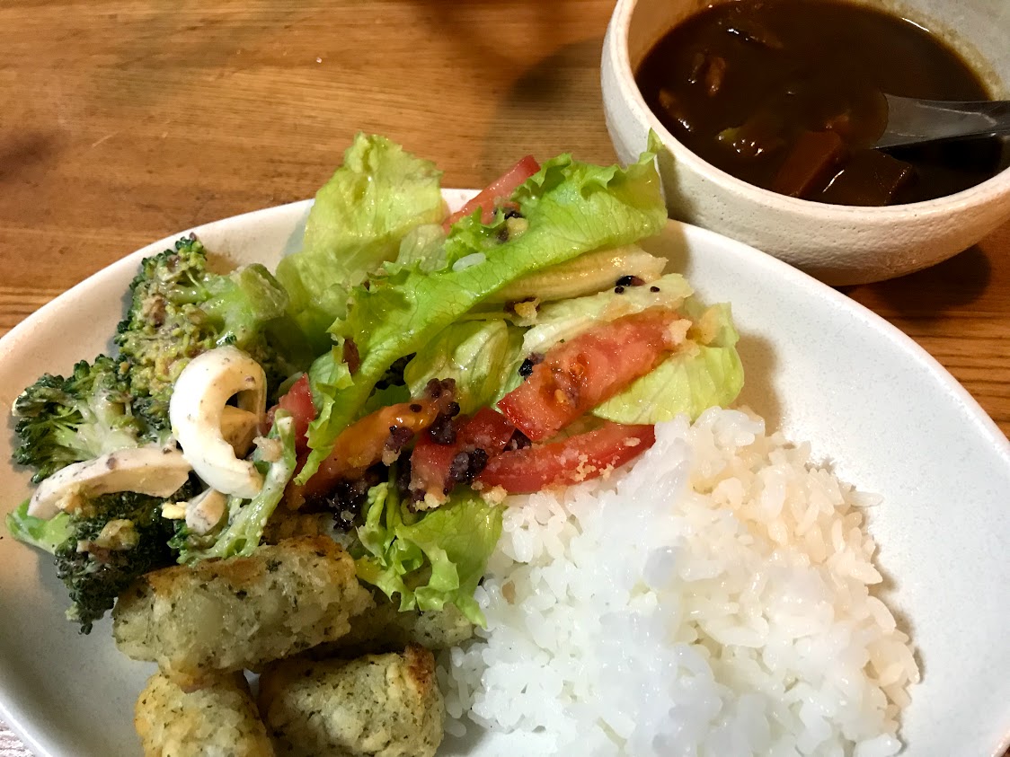 鶏肉と長ねぎのソテー、レモンドレッシング、かぶとひねり揚げのサラダ、小松菜とぶなしめじのにんにく万能つゆ炒め、ブロッコリーとゆで卵のマヨ和え。