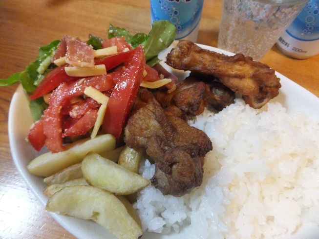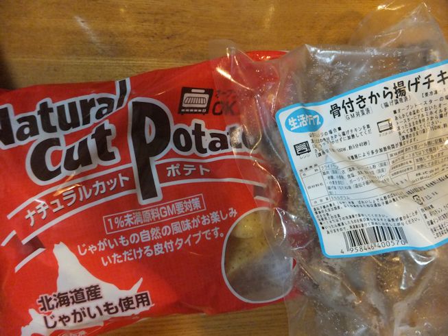 冷凍ポテトとフライドチキンをオーブンで温める。