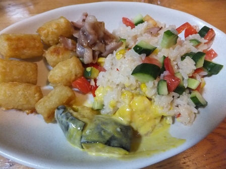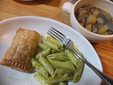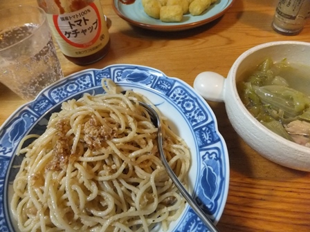 街の人の服の色あいも、茶色や黒が多くなってきました。 10月の初めのご飯です。 ・・・・・・ 冷凍のチキンハンバーグ、 おいしくて便利なので注文しますが、 冷蔵庫に入れると…もちろん解凍されていました。 そのまま一口大の肉団子にして、キャベツと玉ねぎの入ったスープに ぽとんぽとんと落としました。 味もついているし、ニンジンやコーンも入っていておいしいです。 ・・・・・ 冷凍パイシートに、ミートソース缶をはさんで、簡単ミートパイ。 ペンネにバジルソースで、また簡単なごはん。 生活クラブでレンズ豆は扱っていませんが、 レンズ豆を入れたスープはこくがあっておいしいので、 ときどき作ります。 玉ねぎ、ジャガイモ、ニンジンのほか、必ず入るのがごぼう。 ソーセージ化ベーコンを少し入れて、コクを出します。 ・・・・・・ ロールパンのフレンチトースト、 ホットサンドメーカーで焼きました。 ひっくり返すのが簡単です。 ・・・・・・ 見た目は地味なスパゲティ、 納豆のように見えますが、 クルミをすりつぶして、生クリームでのばしたソース、おいしいです。 ・・・・・・ 温かいうちにライスサラダ。 一口ハッシュポテトはオーブントースターで温めるだけ。 手前のカボチャのようなものは何だろうと考えたら、 冷蔵品のカボチャサラダでした。 おいしかったのですが、うちには少なすぎでした。 ・・・・・ 生活クラブでは10月もいろいろイベントがありました。 支部のイベントはこちらにアップしています。 川口ごきげんひろば PR |