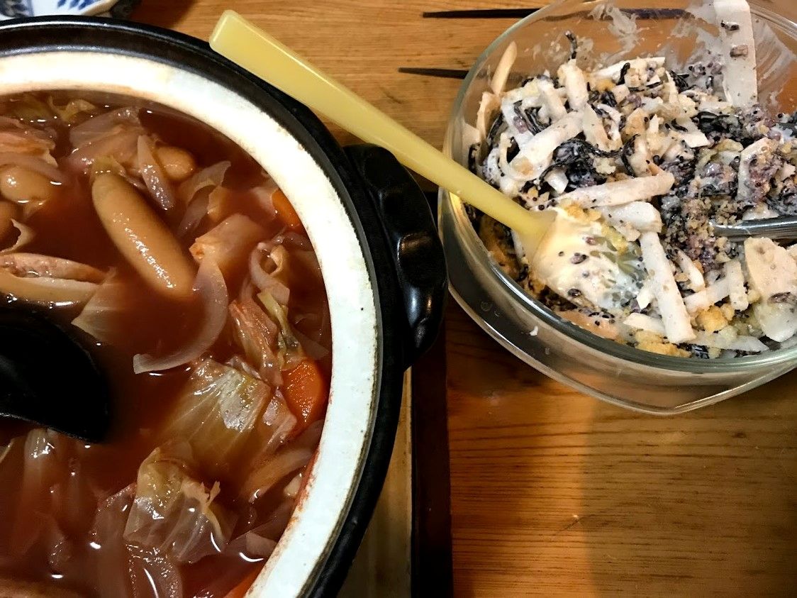 大根、おさかなソーセージ、炊いた雑穀、ひじきのマリネ、ひねり揚げガーリックソルト。