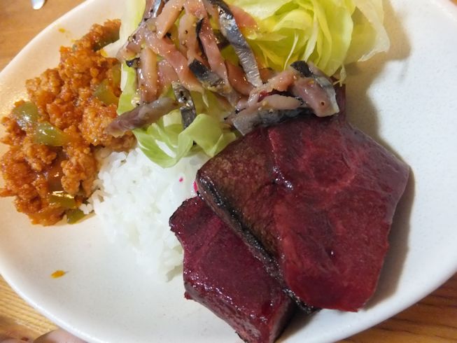 ピーマン入り豚ひき肉のトマトソースはケチャップとソース味。