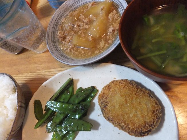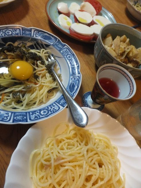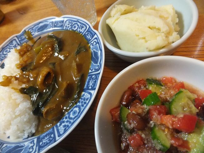 カレールゥフレークを使った日本カレー。辛口と甘口を1袋ずつ使い、鍋いっぱいに作ります。お肉はいつも鶏肉、冬はぶなしめじと小松菜やほうれん草を入れます。 うちの家族はマッシュポテトが大好き。このときばかりは、バターをたっぷり、パスチャライズド牛乳も1カップくらい入れて、とろとろに作ります。沃土会のキュウリが届いたので、金時豆とトマトのサラダ。・コーミの八宝菜ソースを使うと、おいしい中華丼ができます。豚肉、人参、キャベツ、長ネギ。もやしときゅうりとゆで卵は、ポン酢とごま油で中華サラダ。 ・仕事に行く人の朝兼お昼用サンドイッチ。まぐろ油漬け缶と刻みピクルス、モモハムスライス、スライスチーズ、サラダ菜、生チョコスプレッド。 ・餃子をおなかいっぱい食べようと、餃子の皮を4袋も注文したのに、最近、なかなか家族がそろいません。1袋分は4人で、おかずとして食べ、これは2人の時に、1袋半くらいを主食で焼いたもの。玉ねぎとキャベツをフードプロセッサーでガーとすると、早い!包みやすい! ・毎回注文するエクレア。月に一度だけど、毎週あったら、きっと毎週注文します。 ・和風パスタ。おみ漬けのオリーブオイル炒めに卵を混ぜて。もうひとつは辛子明太子。たけのこを炒めるとおいしくて、いくらでも食べられます。モツァレラチーズとトマトもオリーブオイル。 ・秋鮭メンチカツ、6個入っていたので、全部揚げて、残りは翌日のおにぎらずに入れました。付け合わせはきぬさやの炒めたの。大根と鶏ひき肉のそぼろ煮。黄色くなりかけたルッコラの味噌汁。生だとごま風味のルッコラは、煮たら筒菜みたいな青くさい香りになりました。 ・豚白もつ、味噌や醤油で少し甘く煮ていましたが、最近は、カレー風味です。白だしと純カレー粉で、カレーうどんのあっさり版といった感じ。キャベツと長ネギで甘くなりました。 さんまスモークもおいしい。大根スライスと、オリーブオイル、バルサミコを少しかけました。缶詰で、さばのスモークがオイル漬けが、すごくおいしかったと聞いたので、今度届いたら、さんまスモークをオリーブオイル漬けにしてみようと思います。スモーク鯖の小袖susiがあるんだから、さばのスモークも消費材にあってもいいような気もします。奥羽のきびなご一夜干し、フライパンで炒っただけ。豆腐と油揚げの味噌汁。いりこ粉末、十割こうじ味噌 ・味輝の紅茶ロールに、クリームチーズにメープルシロップを混ぜてはさみました。ケーキみたいなデザートパン。水筒2個分入るポットを割ってしまったので、そごうで買ってきた紅茶ポット、上のところが金属メッシュになっているので、茶こしが不要でとても使いやすいです。