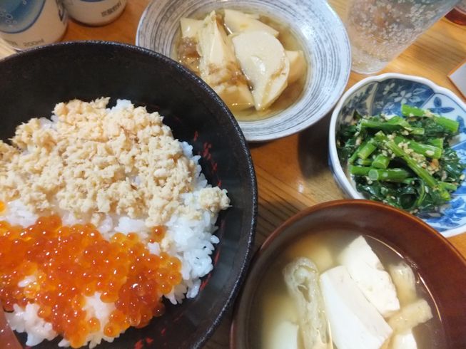 いくらが届いたので、さけそぼろで親子丼。