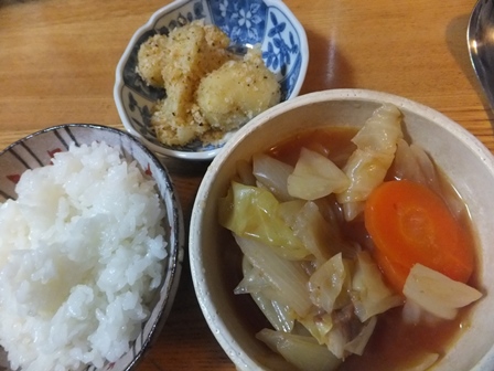 3月になったとたんに発熱で、すぐにさがるのに、すぐにあがり、2週間たち、やっと治りつつあります。風邪だろうが、熱があろうが、料理して食べていました。豆腐とえのきだけ茶漬けで、えのきだけ豆腐 ひややっこに乗せるだけでおいしいえのきだけ茶漬けの素、 冬は湯豆腐のように豆腐を温めた中に入れてみてはいかがでしょう~? 平牧のもつ味噌煮 袋には、野菜と炒めると書いてありますが、うちではいつも、大根ごぼう人参と煮ています。 横綱こんにゃくと、長ネギも入れて、薄味すぎたら、味噌を足します。 平牧もつ味噌煮、お好みさつま揚げと、えのきだけ豆腐に大根おろし。 この日だけで、大根をほぼ1本使いました。 ◆◆ベーコン入りトマトスープとパン粉ポテト。 パン粉ポテトは、ふかしたじゃがいもに、 炒めたパン粉にガーリックスパイスソルトを混ぜたのをまぶしました。 揚げてないから、風邪でも食べられます~。生活クラブのレシピサイト、これいい♪クラブに掲載しました。これいい♪クラブ ◆◆薄切りじゃがいものミルク煮。生クリームを入れてグラタンにするのですが、パスチャライズド牛乳なので、クリームを入れずに煮るだけでもおいしいです。生の細ねぎがあいます。 ◆◆年度末のお買い得品、ビーフシチューのパイ包み焼き 。ちょこっとだけど、濃厚な味。 パン粉ポテトチーズ味と、 ゆでキャベツ、 蒸し玉ねぎのマリネ 。 ◆◆牛すね肉ブロックが冷蔵庫に入ったままになっていて、 この前届いた、牛肉料理ののったカタログが素敵だったので、 ビール煮を作ってみました。 これです、「ビストロ チクレン」 玉ねぎしか入れるものがなく、フランスパンで落し蓋をして煮ます。 が、うちでは、味輝の全粒食パンで。 火にかけておくだけだから、簡単。 パンは、溶けちゃうかと思ったら、もっちりむっちりして、 下半分の汁を吸っているところは、うどん化していました~ これはまた作りたいです。 じゃがいも、ブロッコリー、ひややっこにオリーブオイルと真塩。料理しなくてはならない牛肉の塊が冷蔵庫にある~と思い出すのは、まんが『エイリアン通り』、体調が悪くて料理ができない翼くんが、ぎゅーたん・・・とつぶやいているのです。◆◆日曜日の朝兼昼に埼玉独自品醤油ラーメン。 もう先週。もやしをたくさん乗せました。 生活クラブのもやし、とってもおいしいので毎週注文しています。子どもたちはは二人分を一度に食べました。 10食入りのラーメンが残り4食…