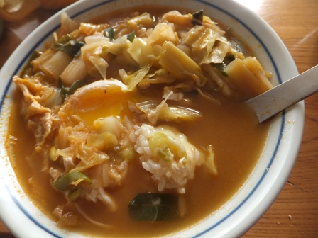 お肉がなくった翌日はご飯を入れて卵を落として。