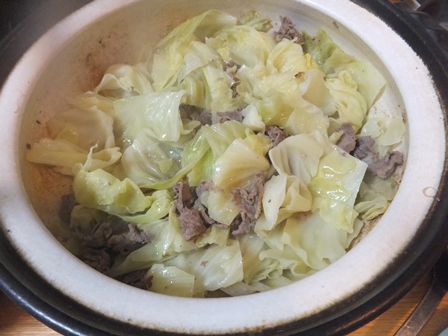 土鍋で牛肉を炒めたところへ、キャベツを大量に入れて、ふたをしてしまうと、