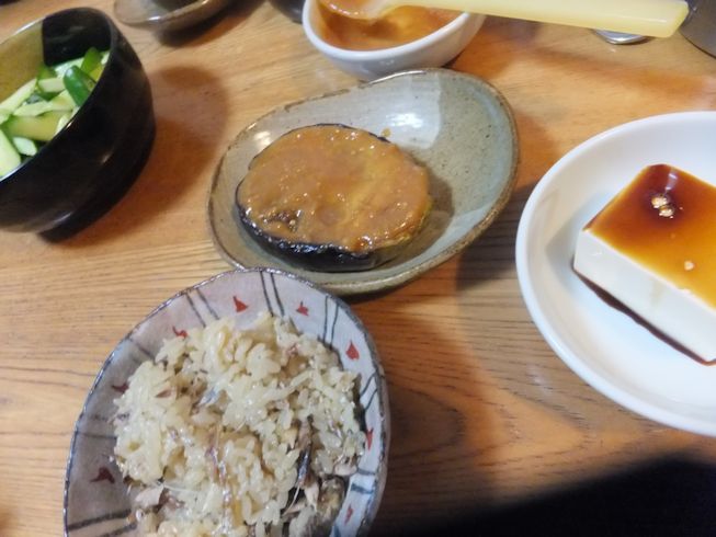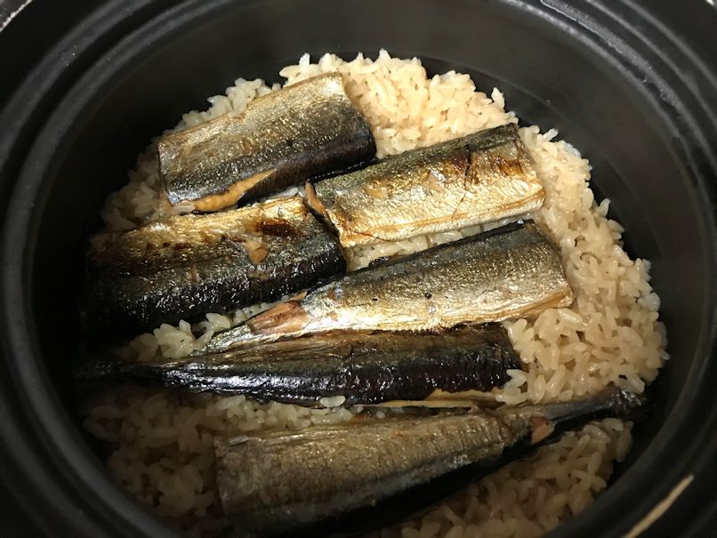 塩と醤油を入れて、半解凍した焼きさんまをお米に乗せて炊いただけ。