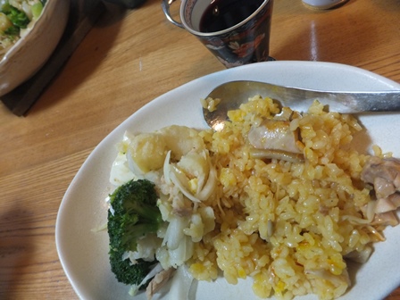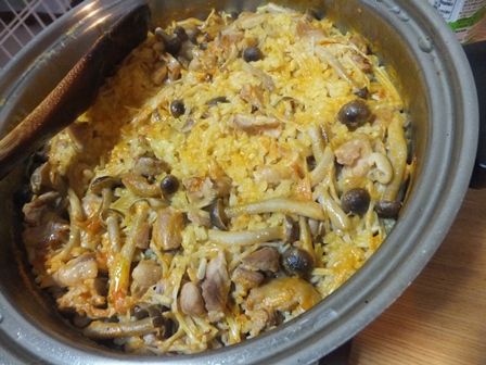 他の具も炒めて、お米を入れて蓋をして炊き上げます。