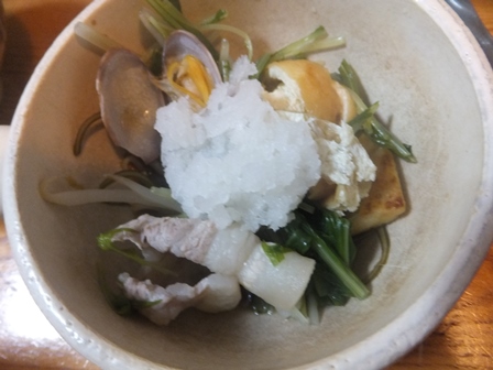 豚肉と、あさりと、油揚げが入っている。ほんとは牡蠣も入ってる。