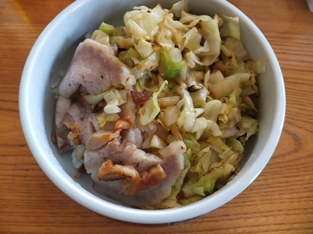 豚肉を取り出してから、刻んだキャベツを炒めてポン酢をかけました。