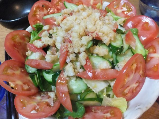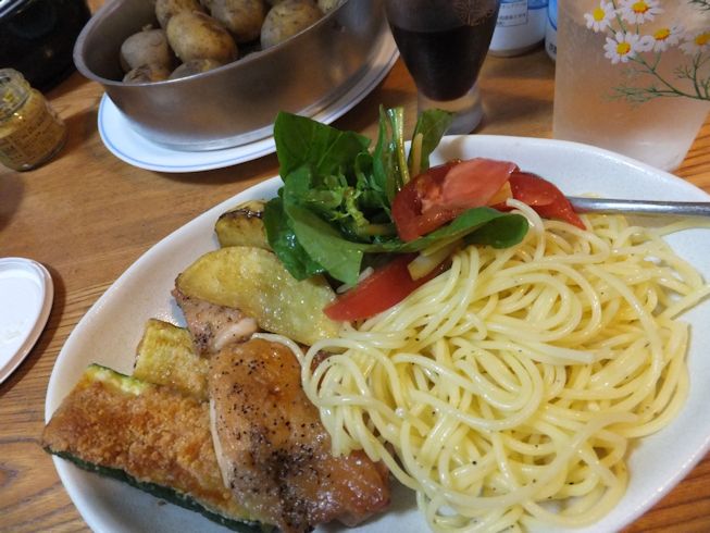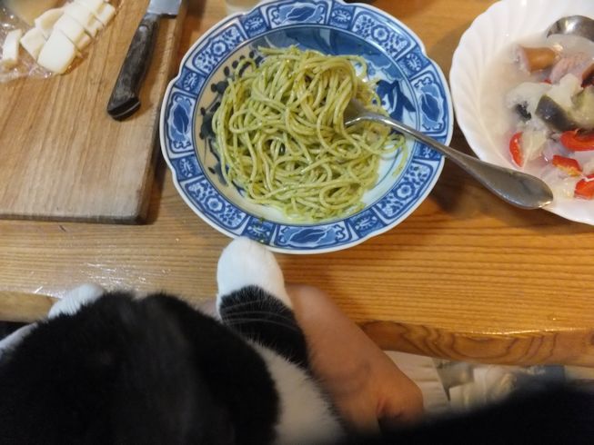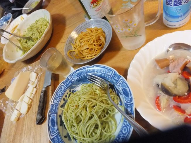 スパゲティは、発掘したトマトミートソースの残りと、冷凍ジェノベーゼソース。