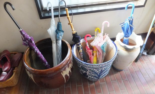 なつかしい玄関の傘立ても健在。