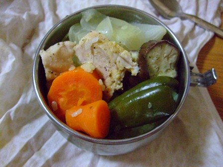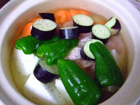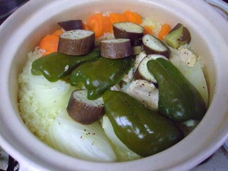 鶏胸肉、玉ねぎ、ピーマン、人参、ナスを乗せました。