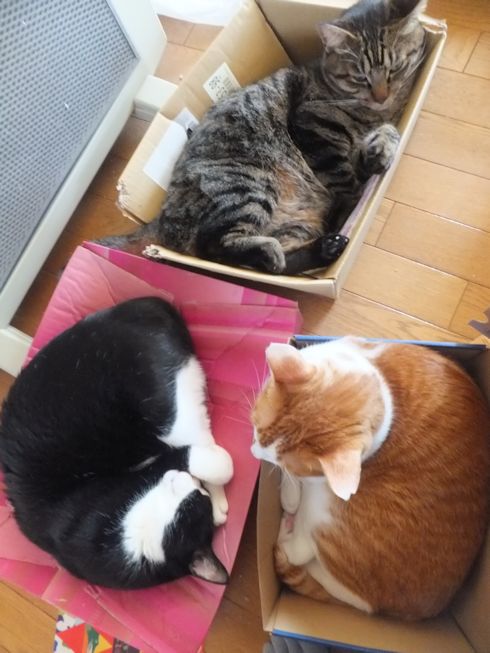 最近の猫たち。ヒーターの前の段ボール箱がお気に入り。
