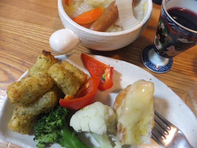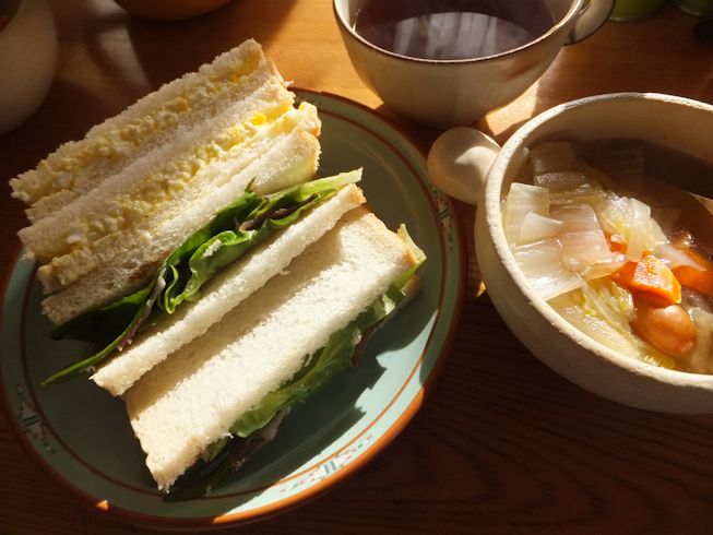 12月2日このところ温かいので味輝の全粒食パンでパンサラダ。トーストして角切りにしたパンに、オリーブオイルと調理用あわせ酢。 夏ならトマトやキュウリを入れるけれど、今の季節にあるもので。フライパンでパプリカをゆでて 卵もゆでて まぐろ油漬け缶と刻みピクルスとレタスも入れて。 注意・パン5枚と卵4個ですが、二人分です! あまりパンを食べない家族もこれだとおかわりします。 自然食品店で買ってきたチェリーのチョコ。(あんまりあまくなくて、生活クラブのほうがおいしい)500円以上もして高いけど、オーストリアまで買いに行かれないから、食べてみたい。 裏を眺めて、へぇ、グルテンフリーでビーガンなんだー。それより驚いたのが、輸入元がおもちゃ箱でした。シュタイナーのおもちゃなどを扱っていて、うちにもいくつかおもちゃや楽器がありました。 12月2日夜自然食品店でザクセンのバケットがあったし、冷蔵庫にミックスチーズが2袋あったので、チーズフォンデュ。ブロッコリー、カリフラワー、パプリカ赤も蒸し煮にして。パプリカ、甘い!冷凍のハッシュドポテトもつけあわせに。 スープは、白菜と玉ねぎ、人参、マイルドあらびきウインナー。白菜は丸ごと買って、外側から使っていき、芯の周りが10センチくらいになったら、1センチくらいの輪切りにしてスープにします。 使いかけのミックスチーズなどの袋は、エニーロックが便利です。筒の中の棒の部分に、折り曲げた袋の口を通すので、はずれにくく、かさばりません。 12月3日味輝の角食パンと平牧の生ハムでサンドイッチ。お店でおいしそうなポスターが張ってあるけど、家で食べればおいしくて安い。オリーブオイルとバルサミコで。もう片方は、子どもが5個くらい食べたいという卵サンド。