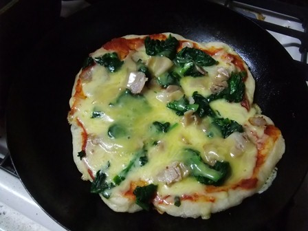 調理実習で使えないかと、フライパンでピザを焼いてみました。