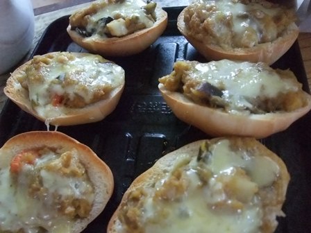 ほぐしたパンと残りのカレーを詰めて、チーズをのせて焼いて、