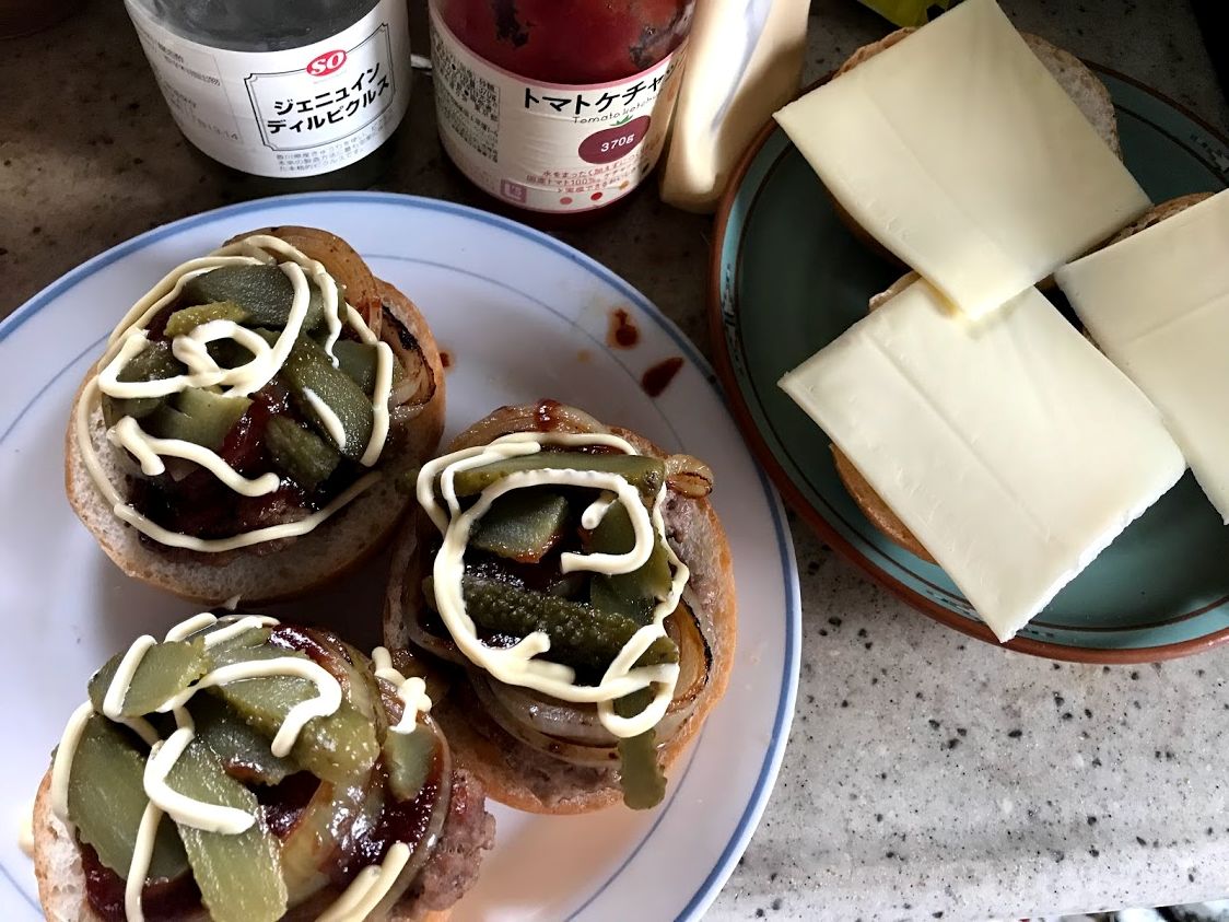 焼いた後で玉ねぎ輪切りも焼いて、ケチャップソースも温めて、