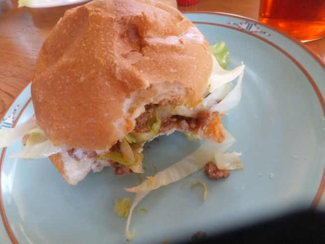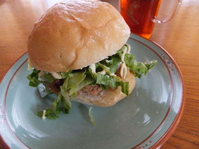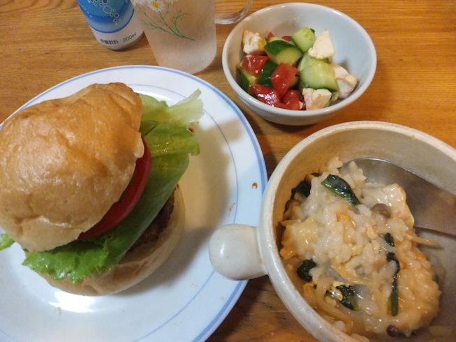 玉ねぎ、ベーコン、キャベツとカレー味のホワイトソース。 ハンバーガー。 豚ひき肉を1パックを3つに分けて、 何もいれずに丸めて伸ばして焼いただけのハンバーグ。 焼いた後で玉ねぎ輪切りも焼いて、ケチャップソースも温めて、 ディルピクルスとマヨネーズ、スライスチーズ。 |