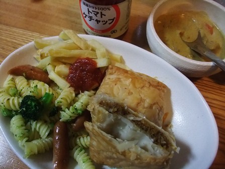 パイシートにミートソース+パン粉をはさんで焼いたもの。