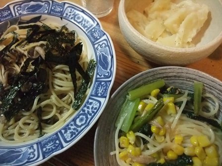 しめじとのりのスープスパゲティは醤油バター味(牛乳)