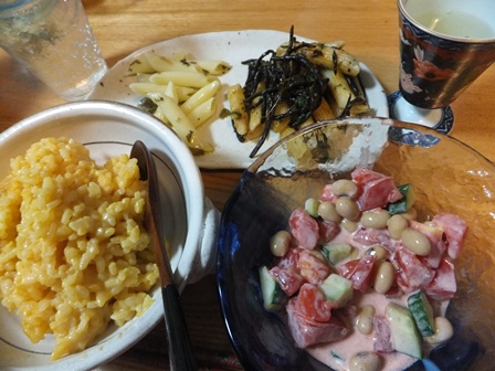 エビのビスクスープ 今度はリゾットにしてみました。 冷やご飯がなかったので、お米から。 お鍋で、刻んだ玉ねぎをオリーブオイルで炒めたところに、 お米を入れて少し炒め、水を加えて、ご飯を炊きます。 かために仕上げたかったので、蒸らす時間はとらず、 芯が残っているところに、えびのビスクスープと、牛乳を加えて 混ぜながら温めました。 とっても簡単でおいしい。 味が濃い目のスープなので、ご飯やパスタと混ぜても食べやすいです。 トマトのマヨネーズサラダは、きゅうりと大豆ドライパック入り、 スクリューマカロニは ひじきのにんにん炒めと、しば漬けオイルで。 来月、支部で料理の企画があるので、 ひじきづいています。 にんにく炒めもおいしいです。 PR |