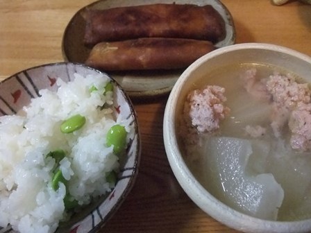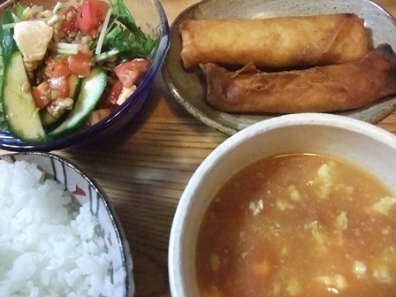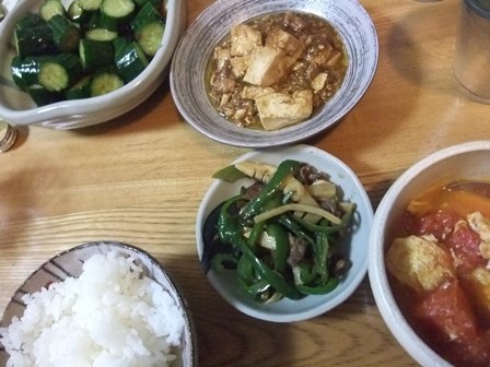川口ごきげんひろば なにより手軽でおいしいので、ぎょうざが毎週のように届きます。 しそ餃子と一緒に。 なすのほたほた煮、 冷奴にはみょうが、 きゅうりは中華ドレッシングをかけただけ。 マルハニチロさんの春巻きも冷凍で便利。 中がとろっとしていて、お店で食べるよりおいしい春巻き、 多層鍋でふたをして揚げると、皮がパリッと揚がることが最近分かりました。 枝豆秘伝の豆ごはん、 今年最後のミニ冬瓜と鶏肉団子の煮物。 便利なソースもいろいろとあります。 これは麻婆豆腐のソース。 ひき肉や香味野菜を炒めたら、ソースと豆腐を入れて温めるだけ。 二袋組になっていて、一袋で豆腐1丁分できます。 やはり35万人アクション品になっている牛肉と、 ピーマンとたけのこ缶で、青椒肉絲。 これもソースがあると思いますが、今回は牡蠣味調味料と醤油で。 中華鍋は洗わないで、生姜、にんにく豚ひき肉を炒めて、麻婆豆腐を作り、 次に鍋をざっと洗って、ふんわり卵焼きをつくったら、 卵を溶いたボウルに一度戻し、 ざく切りにしたトマトを強火で炒めて、卵を戻しいれ、 塩、米酢、素精糖で甘酢味に仕上げました。 きゅうりは両面に斜め包丁を細かく入れて中華ドレッシングをかけておくと、 漬け時間が短くても、味がしみておいしくできます。 中華鍋一つでどんどん作れるので、たぶん調理は30分かかっていません。 わたしが刻んで鍋に入れ、子どもが炒めて、あっという間にできあがりました。 |