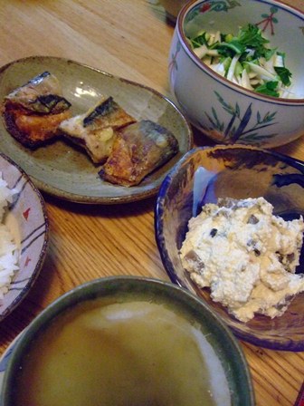 衣をつけようかと思いましたが、 とろけないほうのタイプにしたら、 小麦粉をつけるだけで大丈夫でした。 サンマとチーズ、ぴったりです。 サンマのチーズはさみ焼 かぶら蒸しーれんこん、人参、きくらげ 白和えーこんにゃく、しめじ、人参 かぶの皮と葉の塩もみ かぶら蒸しは、 ばーさんがじーさんに作る食卓を読んで作りたくなりました。 かぶはすりおろしに卵白を混ぜただけ、 具は野菜だけにしましたがおいしいです。 あんは、白だしを使いました。 白和えは、豆腐が残っていたので。 木綿豆腐はざるで裏ごしして、 白みそ、ねりごま、素精糖、薄口しょうゆで味付け。 こんにゃく、しめじ、人参に少し味をつけて煮たものをあえました。 イカの塩辛は、前日までよりおいしくなっていましたが、 3日目でなくなりました。 |