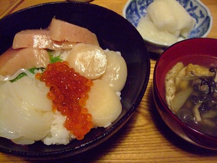 いくら、ほたて、いかが、それぞれ一人分ずつ、 小分けされてはいっています。 だから、酢飯に乗せるだけ。 豪華に、びんながまぐろも乗せました。 家族みんなが、自分の誕生日はこれでいいからと言っていました。 11月から毎月あって、今月で終わりなので、当分ありませんが… 長芋を甘く煮たの ごぼう、しめじ、油揚げのおつゆ |