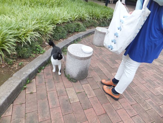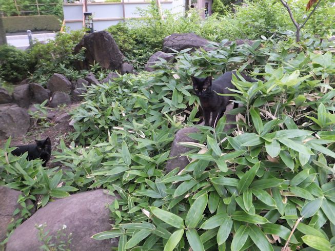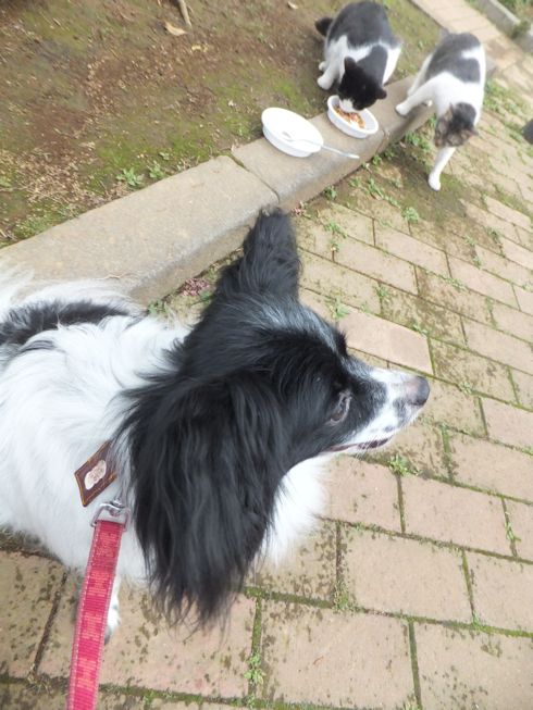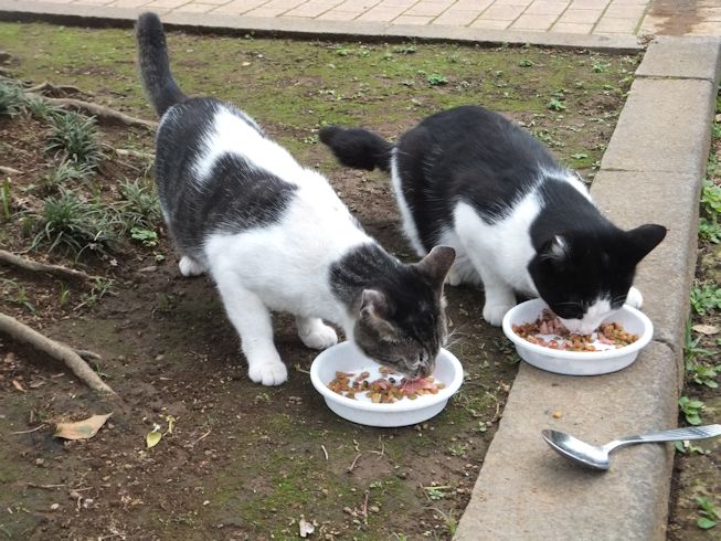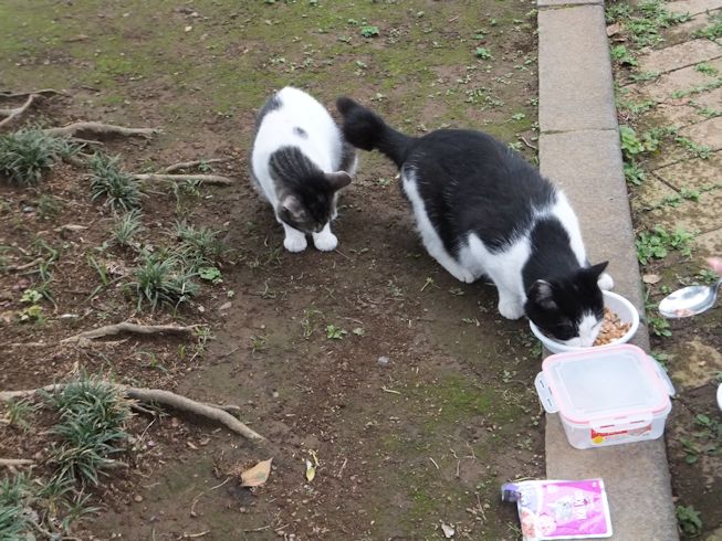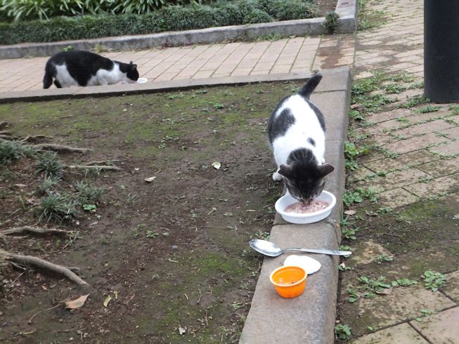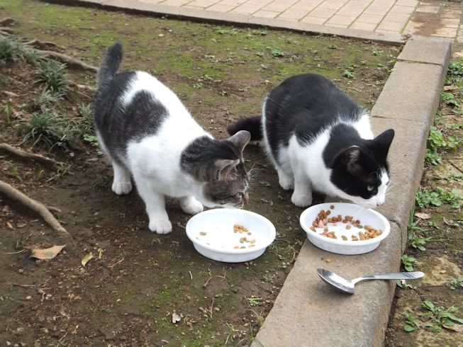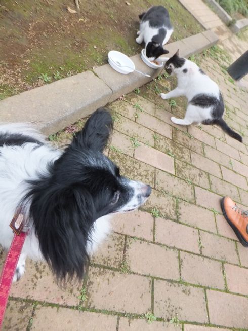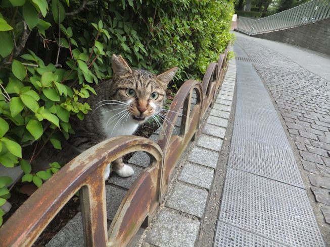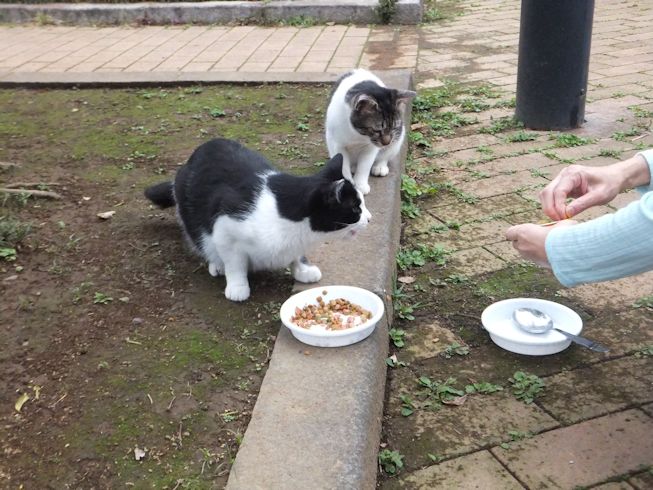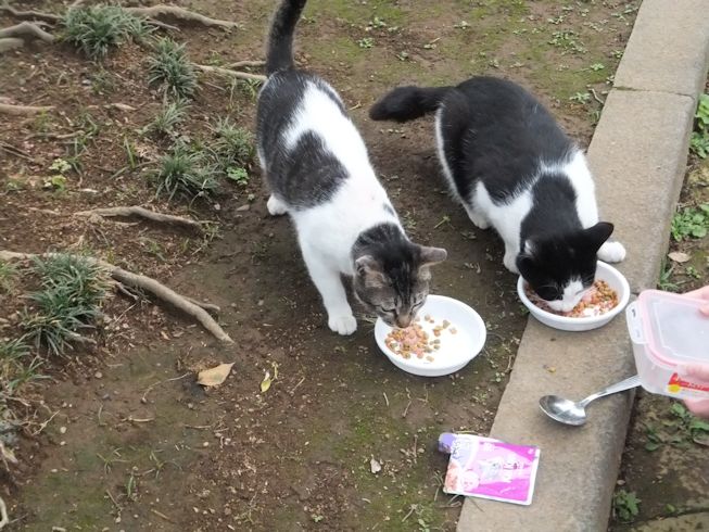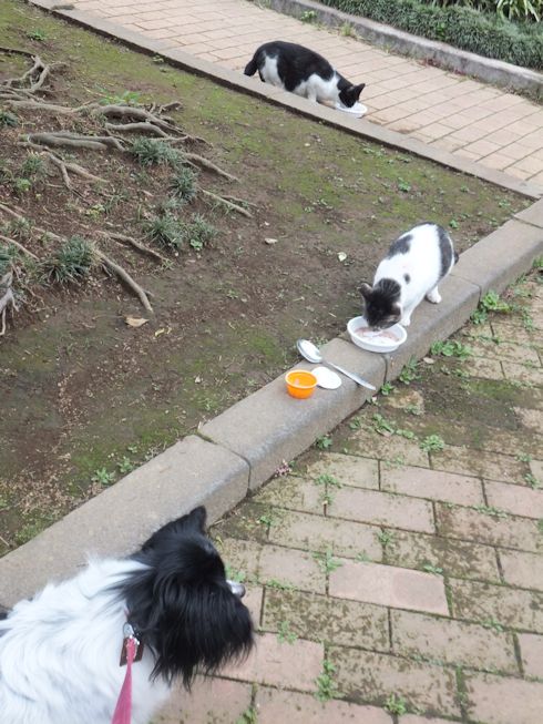 梅雨空。雨や曇りの日は涼しく、晴れると夏日になります。 公園に、新顔の猫さん登場。ひと月くらい前には、公園の外で見かけた、足が悪い子です。食べるときには、顔を傾けるので、歯も痛そうです。犬がワンワンいうように、ニャウニャウというので、ニャウと呼ぶことになりそうです。 ひとなつこい ちびちゃん。 翌日は、水辺の近くで。ちびはしっぽが長くてまっすぐ。 こちらは、しっぽがかぎになっている、きいちゃん。左目が悪いのか、ぱっちり開きません。 右耳の先がカットされています。これはけがのためではなく、野良で避妊去勢手術済みとわかるように、病院でカットされています。さくらの花びらみたいに見えるので、さくら猫と呼ばれたりもしているようです。去年、このあたりで、野良のお母さんから生まれた子たちですが、お母さん猫も、捕獲して手術したので、この子たちから猫が増えることはありません。 捨てられた子猫をみつけたときには、人なれしているので、すぐに捕まえられて、里子に出すこともできます。(うちの4匹は全部、拾った猫です。みんな捨てられ猫だったのでしょう。)野良猫母さんから生まれた、子どもたちは、人には気をつけるように、教え込まれているようで、人が来ると隠れたり逃げたり、小さいうちには捕まえることができませんでした。そうすると、こんなふうに地域猫で暮らすことになります。外猫たちは、体力だけが勝負。えさをもらえなければ、食べるものも良くないし、カラスにも狙われるし、病気や事故にもあいやすいです。元気な姿に会えるとほっとします。二匹いますがわかりますか~? はなと散歩していても、なかなか猫たちは出てきませんが、ねこだいらさんが鈴を鳴らして歩くと、猫が顔を出します。これは、ジュニアの子どもの、コジュニ。さっきごはんをもらったのに、ここにいるよと、茂みの中から、にゃごにゃご鳴き続けて、最後に顔を出しました。この子の右耳もカットされています。 がっちゃんもきたよ。 さっきごはんを食べた、くまたも来ました。 また食べちゃう。 並んで食べて 並んで、??? いいなーと眺めていた、はなを撮っていたら、食べ終わった、くまたが、がっちゃんの後ろを回り、 そうっと近づいて、 いったん座り まだごはんが入ってるのを確認して 自分の器は空なのも確認して ちょっとちょうだい、ほんの一粒! とがっちゃんの器から、かりかりを取り出していました。 それで、またいいものが出てきました。 空いた器がなめたいはな。なめていいでしょうか~なめたいです~ 食べた食べた~ がっちゃんはライトの上。 くまたはのんびり座っていました。