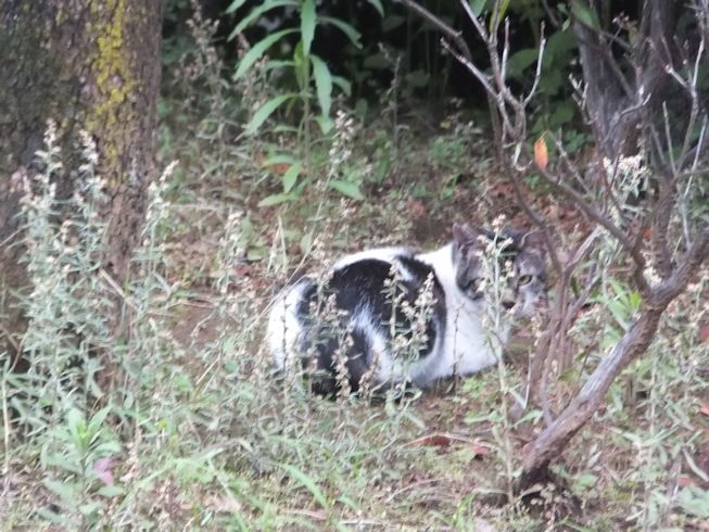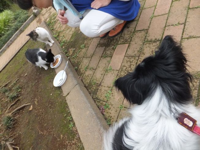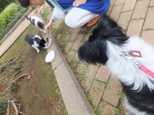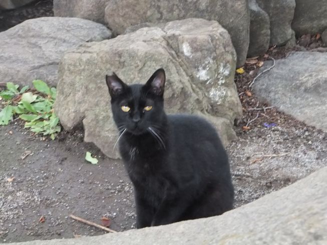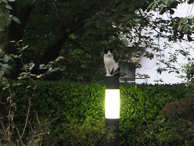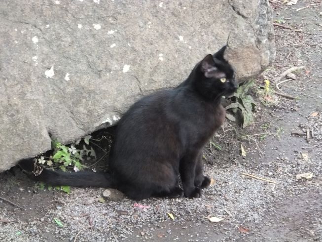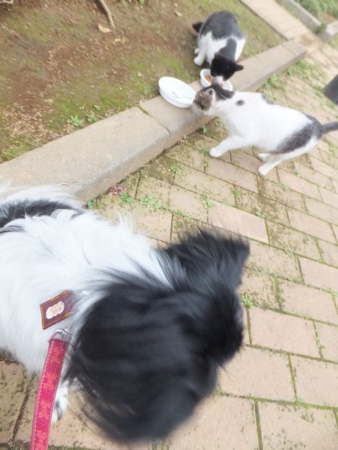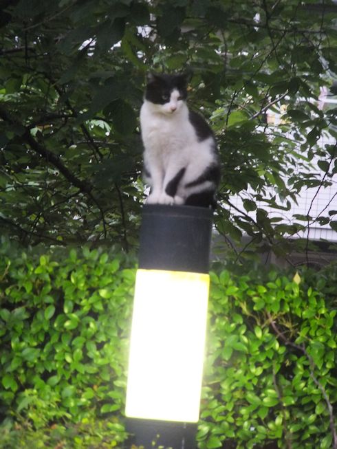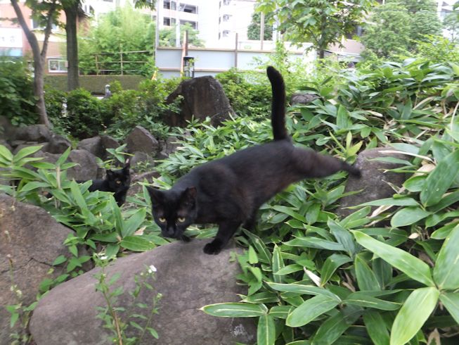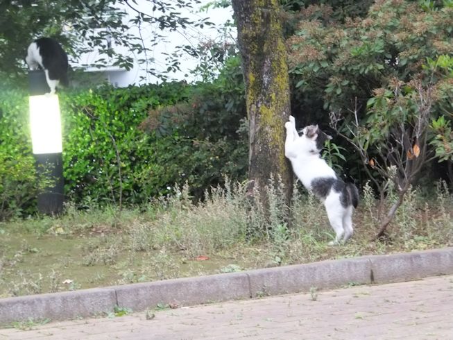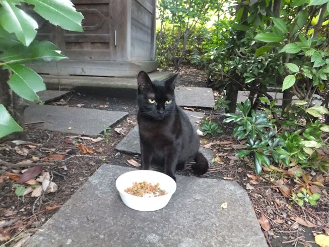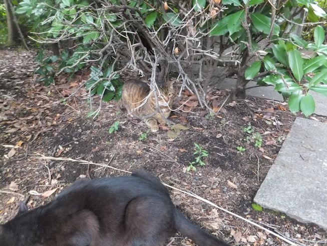 梅雨空。雨や曇りの日は涼しく、晴れると夏日になります。 公園に、新顔の猫さん登場。ひと月くらい前には、公園の外で見かけた、足が悪い子です。食べるときには、顔を傾けるので、歯も痛そうです。犬がワンワンいうように、ニャウニャウというので、ニャウと呼ぶことになりそうです。 ひとなつこい ちびちゃん。 翌日は、水辺の近くで。ちびはしっぽが長くてまっすぐ。 こちらは、しっぽがかぎになっている、きいちゃん。左目が悪いのか、ぱっちり開きません。 右耳の先がカットされています。これはけがのためではなく、野良で避妊去勢手術済みとわかるように、病院でカットされています。さくらの花びらみたいに見えるので、さくら猫と呼ばれたりもしているようです。去年、このあたりで、野良のお母さんから生まれた子たちですが、お母さん猫も、捕獲して手術したので、この子たちから猫が増えることはありません。 捨てられた子猫をみつけたときには、人なれしているので、すぐに捕まえられて、里子に出すこともできます。(うちの4匹は全部、拾った猫です。みんな捨てられ猫だったのでしょう。)野良猫母さんから生まれた、子どもたちは、人には気をつけるように、教え込まれているようで、人が来ると隠れたり逃げたり、小さいうちには捕まえることができませんでした。そうすると、こんなふうに地域猫で暮らすことになります。外猫たちは、体力だけが勝負。えさをもらえなければ、食べるものも良くないし、カラスにも狙われるし、病気や事故にもあいやすいです。元気な姿に会えるとほっとします。二匹いますがわかりますか~? はなと散歩していても、なかなか猫たちは出てきませんが、ねこだいらさんが鈴を鳴らして歩くと、猫が顔を出します。これは、ジュニアの子どもの、コジュニ。さっきごはんをもらったのに、ここにいるよと、茂みの中から、にゃごにゃご鳴き続けて、最後に顔を出しました。この子の右耳もカットされています。 がっちゃんもきたよ。 さっきごはんを食べた、くまたも来ました。 また食べちゃう。 並んで食べて 並んで、??? いいなーと眺めていた、はなを撮っていたら、食べ終わった、くまたが、がっちゃんの後ろを回り、 そうっと近づいて、 いったん座り まだごはんが入ってるのを確認して 自分の器は空なのも確認して ちょっとちょうだい、ほんの一粒! とがっちゃんの器から、かりかりを取り出していました。 それで、またいいものが出てきました。 空いた器がなめたいはな。なめていいでしょうか~なめたいです~ 食べた食べた~ がっちゃんはライトの上。 くまたはのんびり座っていました。