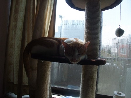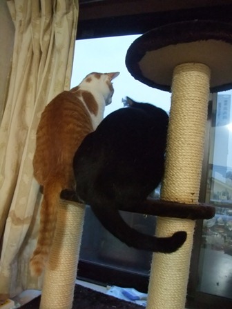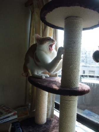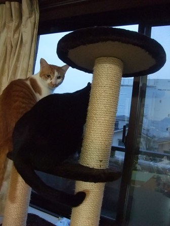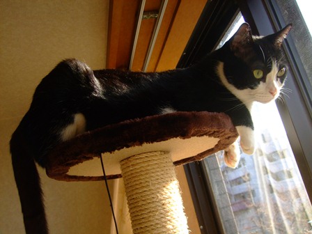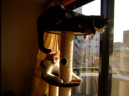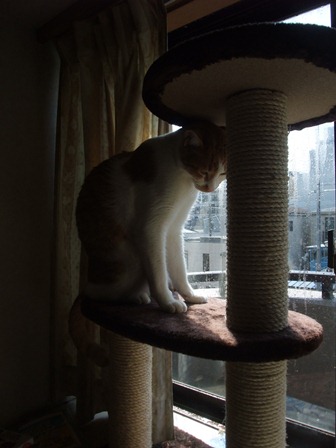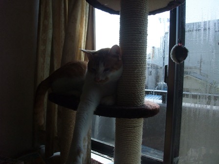 ベランダの外が見えるように、出窓に猫用の台を置いたら、