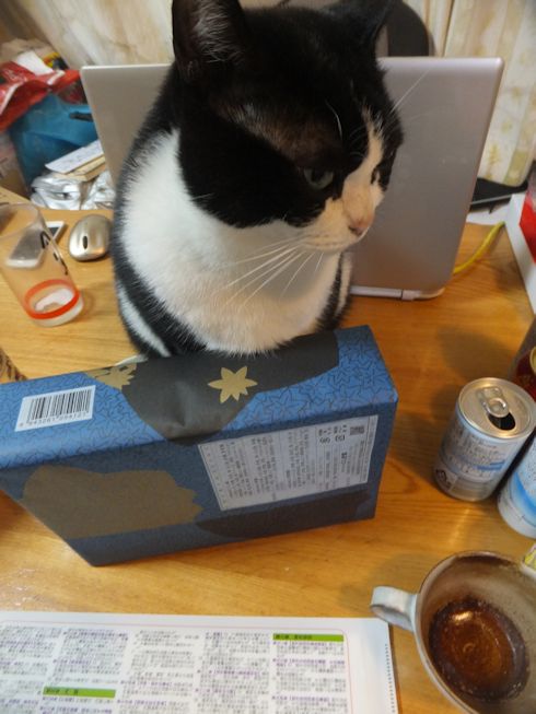 なぜか、テーブルの上の、パソコンと箱のすき間に座るぱたぽん。