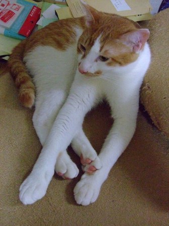 座椅子で足をあげて、いい湯だなポーズで大あくび