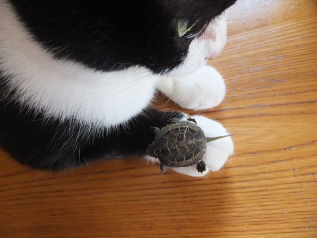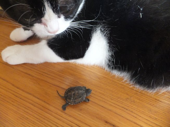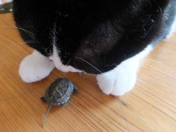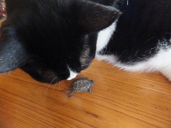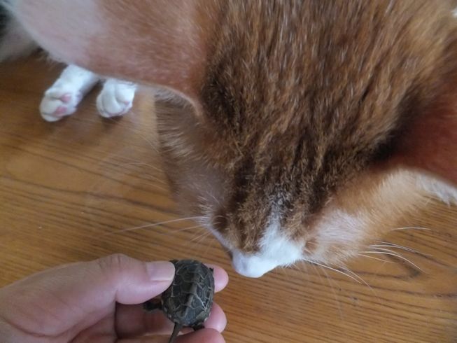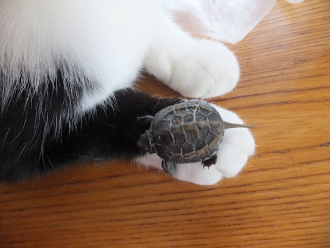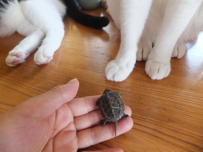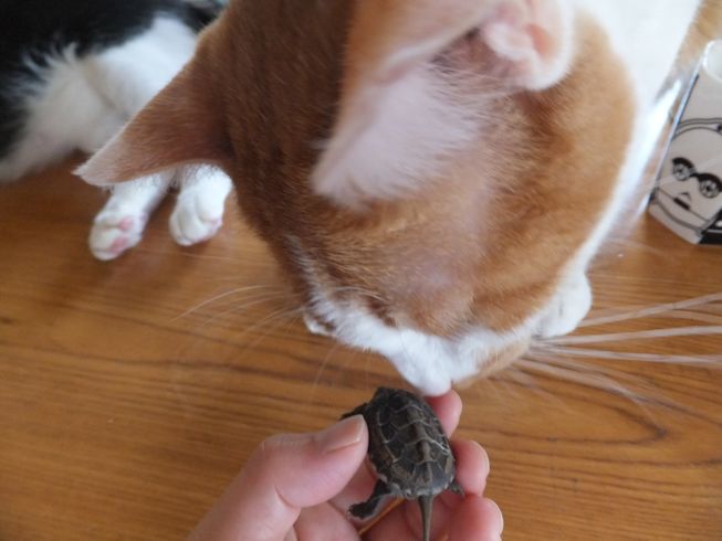 また道路向かいのお寺の脇で、亀を拾いました。 2年くらい前にも拾いました。 ガメラちゃんとの一週間 今度は、小さい亀です。 ぱたぽんに見せてみました。 においをかいでみます。 ぱたぽんの前足より小さい。 興味なし。 までろんも見に来た。 までろんはこわいので、持ったまま。 においをかいだけど なんだ、これ・・・ 興味なし。 こんなに小さな足にもぎざぎざが。 この後すぐに、亀池のあるお宅に返しに行きました。 前日の台風の大雨で、池の水があふれて、でてきちゃったのかもしれません。 夜は、冷凍庫にあったうなぎと、 使いかけの冬瓜で味噌汁。 買ってきた、三之助の厚揚げと水なす。 水なすは切ってからしばらく塩水につけて、 生活クラブのもろみ味噌をつけました。 PR |
