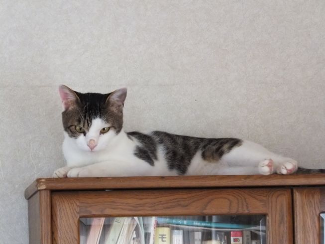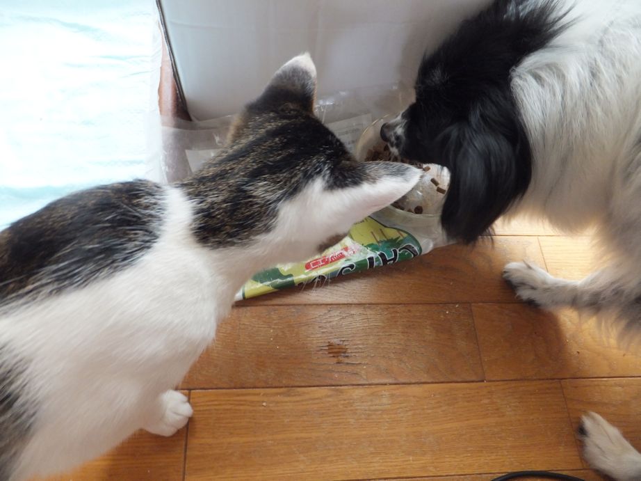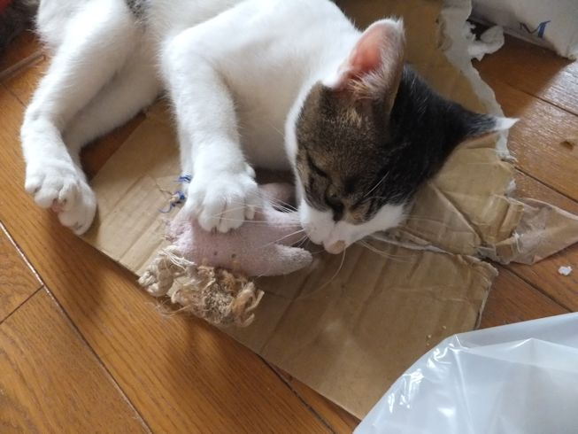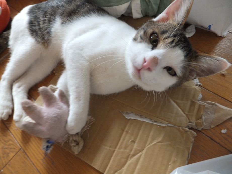 土日で予定がない時には、川口駅の譲渡会に出してもらう予定です。やせ細っていたので、いつまでも食べていたい病です。はなのごはんもねらっています。はなは、うなるけど攻撃しないで、顔を割り込ませられないように、自分の顔でふさいでしまいます。 猫の好きそうなところは、どこでも好き。 はなのおもちゃが一番のお気に入り。くわえて持ち歩き、遊んでいます。