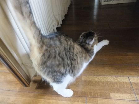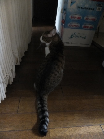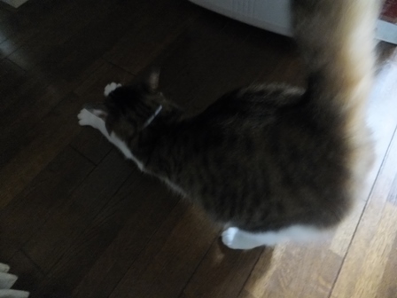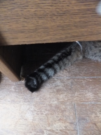 ベッドの下からしっぽだけ出して、すねているすえちゃん。