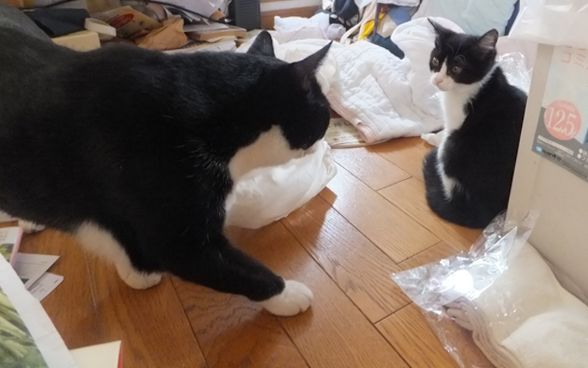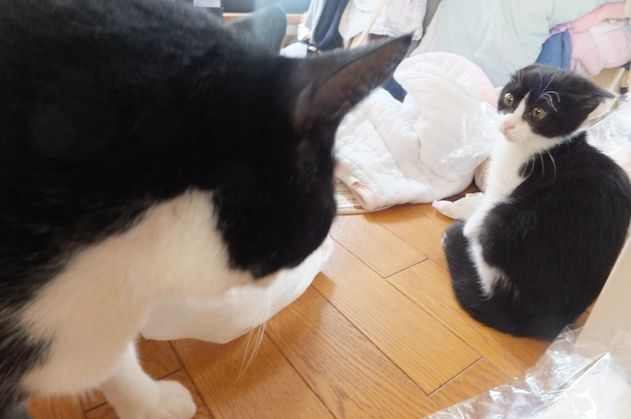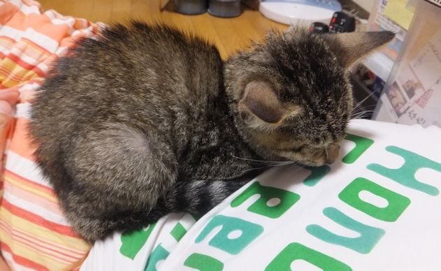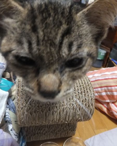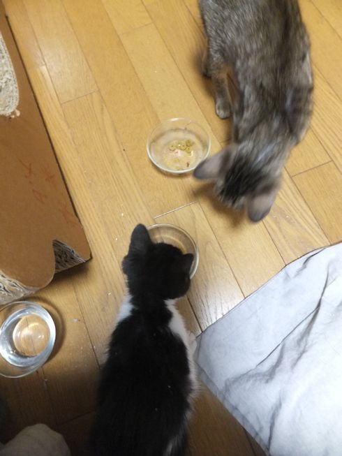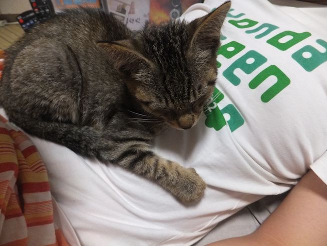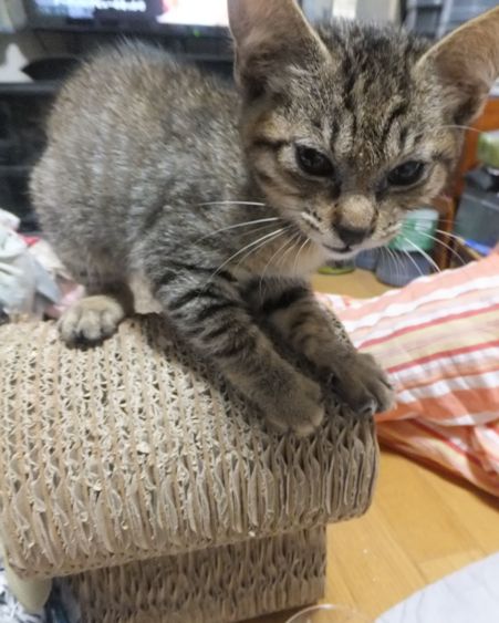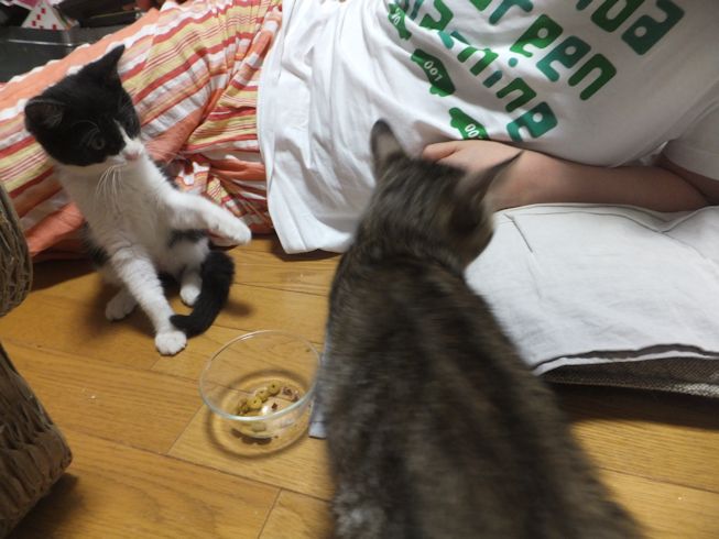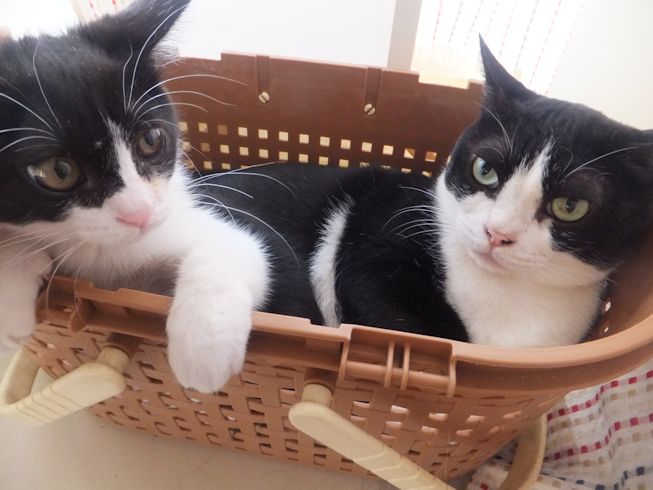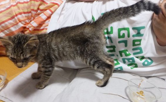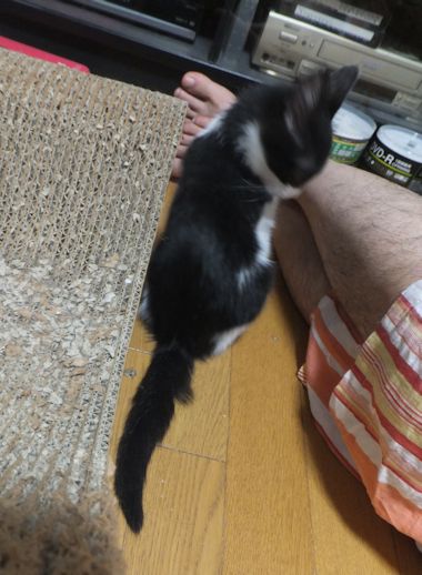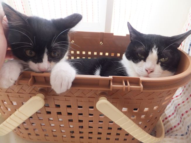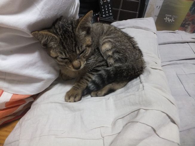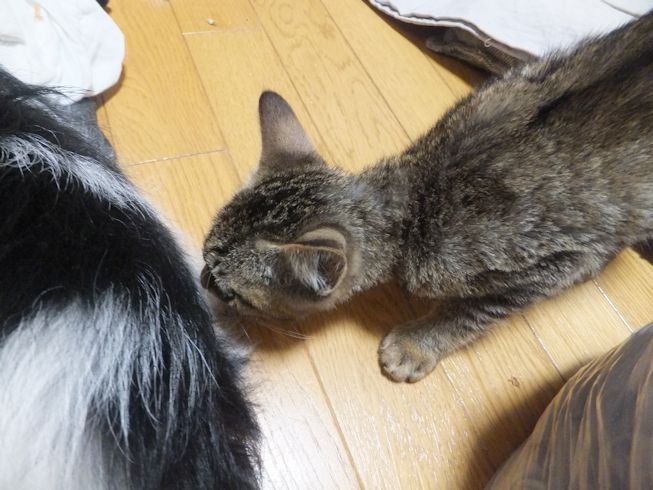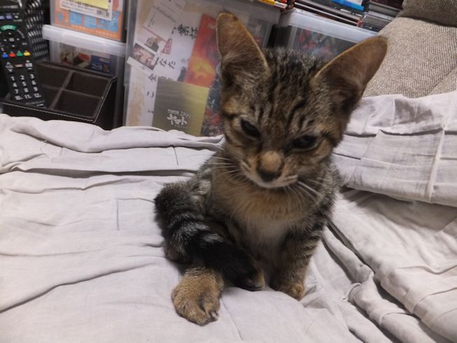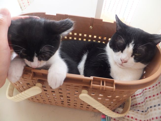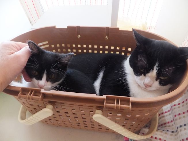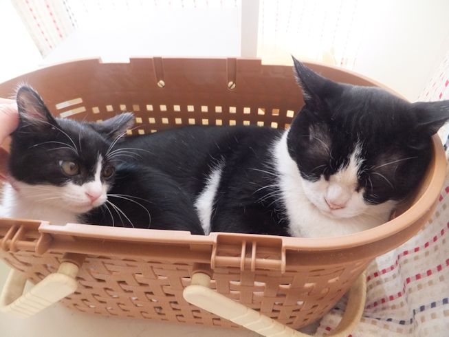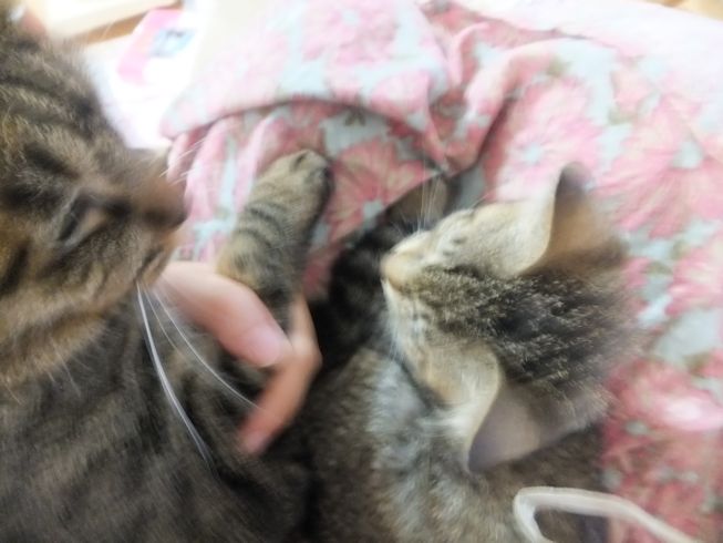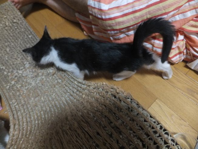 子どものまち探検のつきそい中に電話があり、 わたしが動物病院に連れて行きました。 柄はぱたぽんだけど、性格は苑子そっくり。 気が超強いお姫様です~ 一日22時間くらい、隠れています。 やっと今日遊びだしましたが、明日はお帰りです。 かんたも里子に出さなくては~ しまととに性格も似ていて、気のいいぼくちゃんです。 |