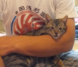 子猫もえさをもらって、ちょうどつかまえることができました。