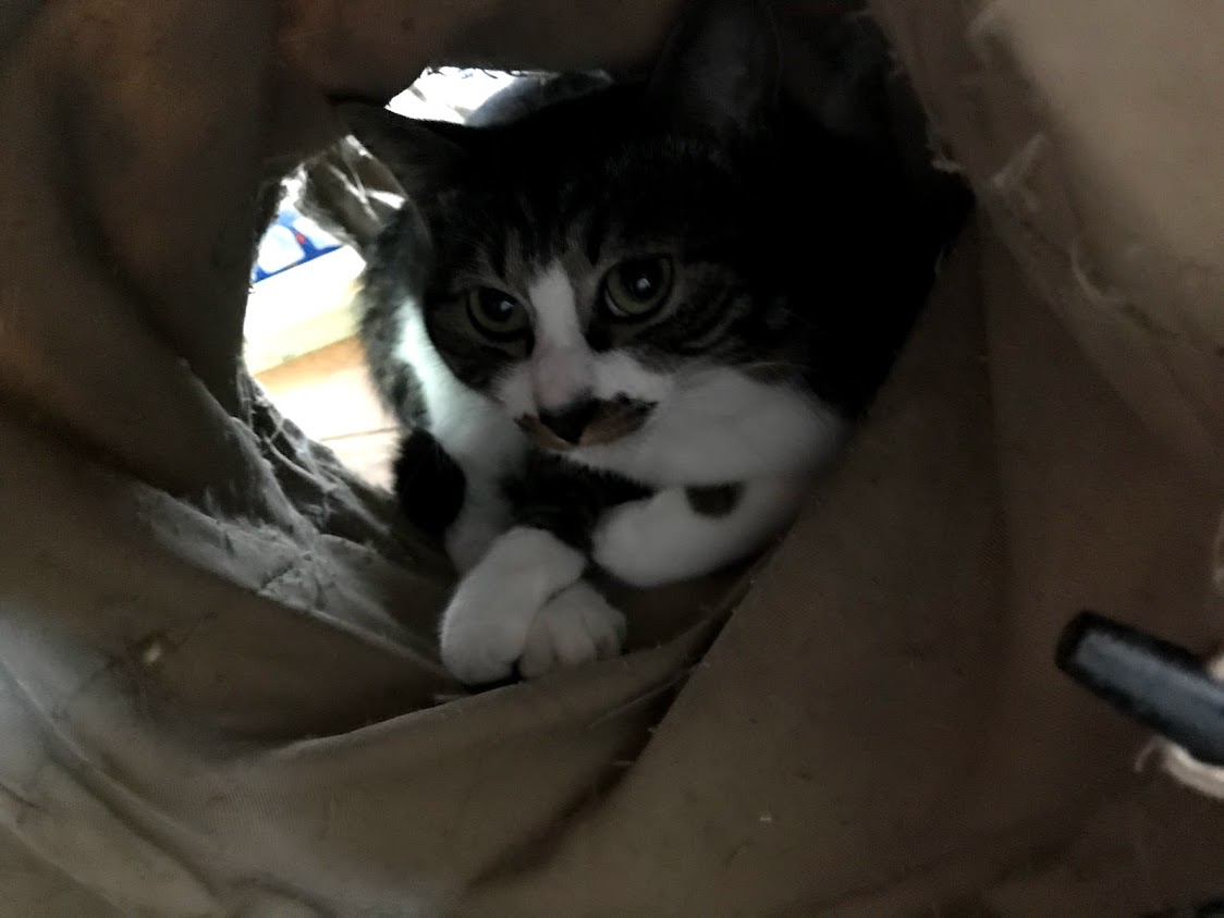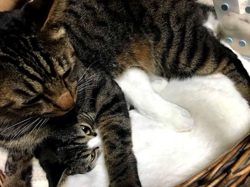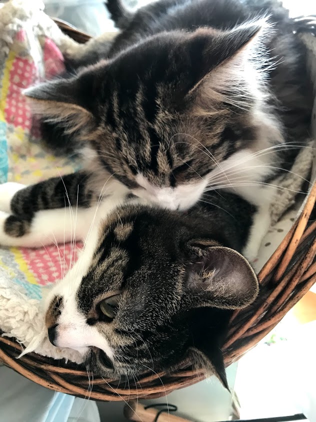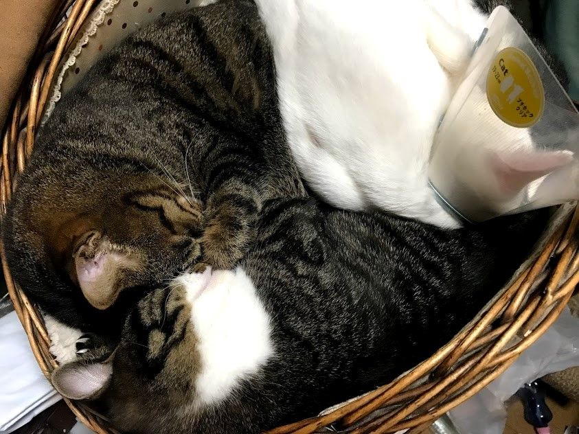 しまととが、えいっとかごに乗りました。そのまま座って?います。 その下にはシャアがいたんですけどー 顔を出してあげました。 しまとともアムロも、ごろごろいってるのでなんだか幸せな気持ちになってきたのか、埋もれたままゴロゴロいいだしたシャア。