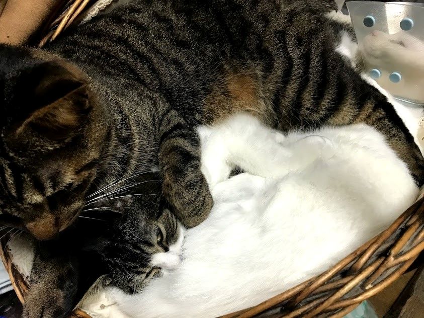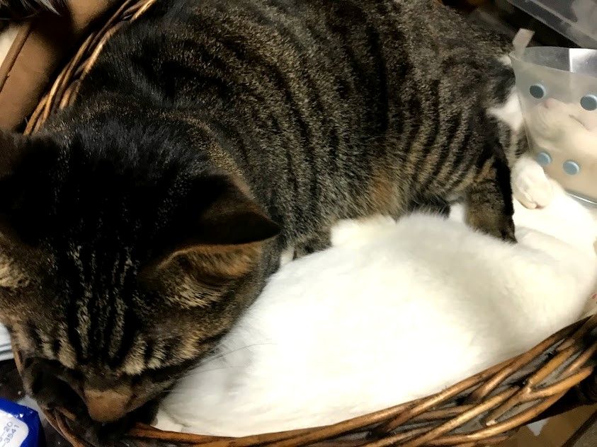 長々とアムロ。最近ひとのことをよく見に来ます。 アム~とかアムちゃんと呼ぶことも多く、顔つきも、いつもゴロゴロいってるのも、イブキに似ています。イブキもイブ~と呼んでいました。大きなかごなのに、シャアの上に乗るガブ。 シャアに似ている公園のチョビオ。体型も、顔つきも、ごはん大好きなのに話しかけるとシャアというところもみんな似ています。 昨日はキイちゃん、ジュニア、チビ、チョビオ、マルオがいました。ギンジ以外はみんな、はなとわたしをみつけると声をかけて来ます。ハチとコマチは、鳴かないで、しっぽをぴんと立てて走ってきます。みんなかわいい。