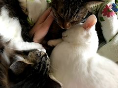元日の朝の猫だらけのふとん。 朝方、アムロがわたしの上にやってきます。すぐに左わきにすべりおりて、うまくはまります。そこはかんたもお気に入りの場所です。この日はガブもやってきていました。