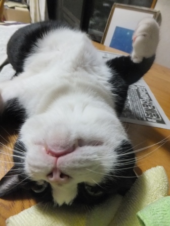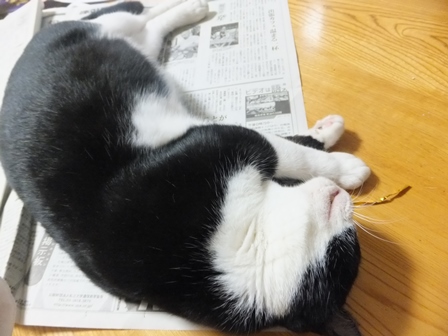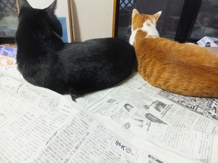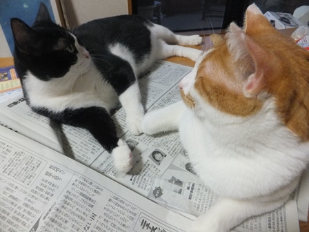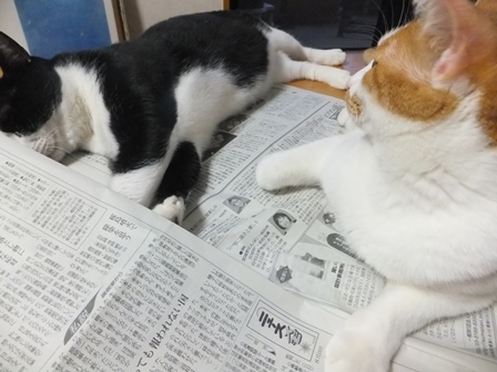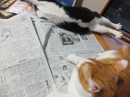 新聞を広げると、いつのまにやらやってきて、ねころぶ猫たち。