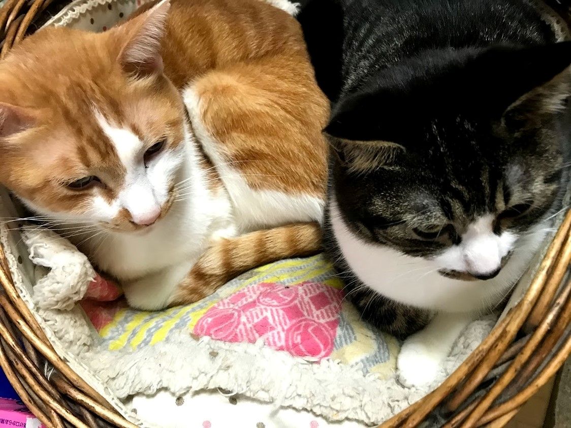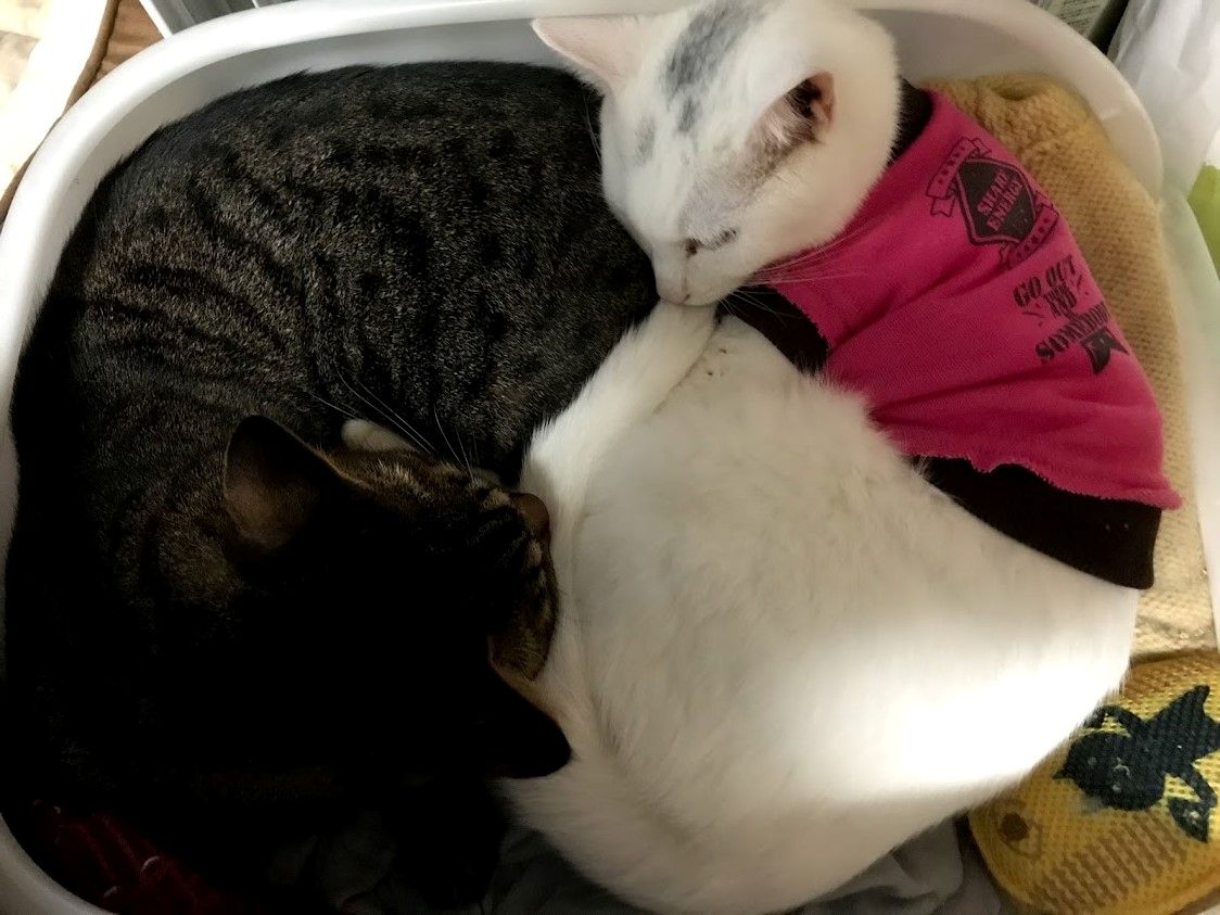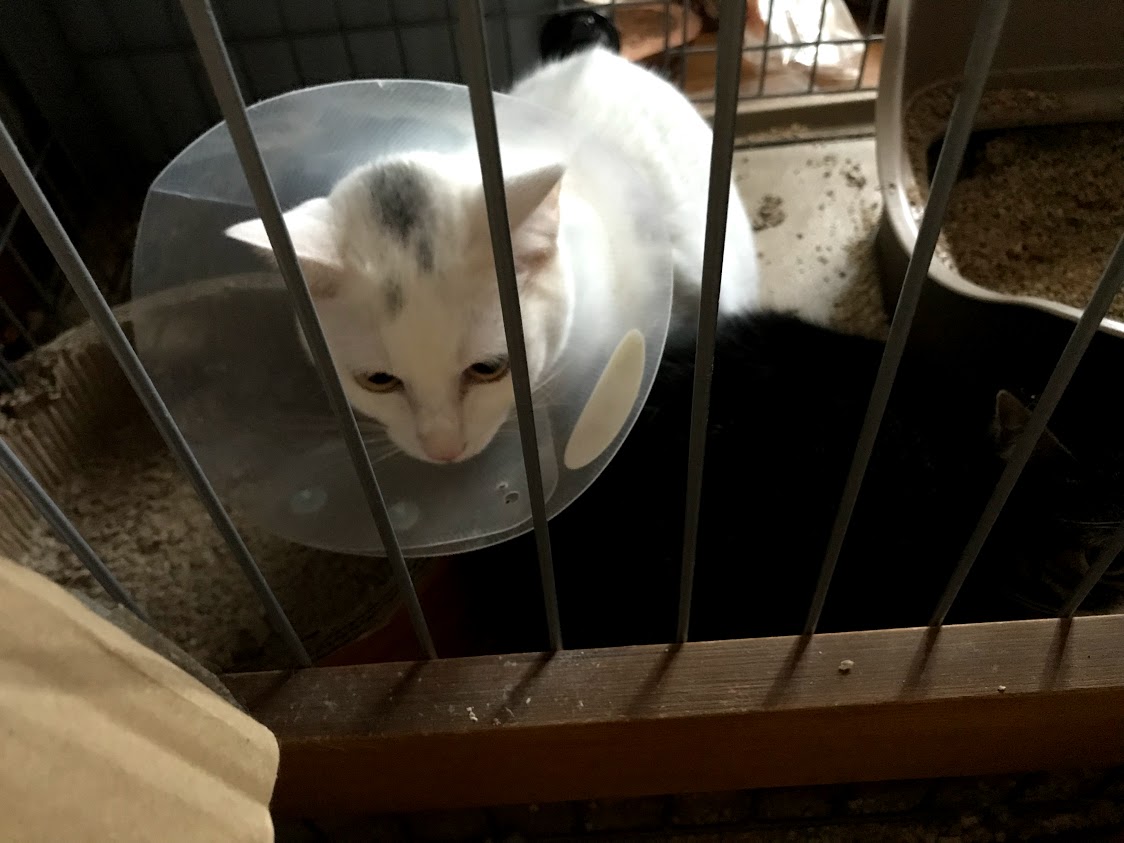 日曜日、今日が譲渡会。押し入れに隠れる前のシャアをケージに入れたらごはんを食べない。ので、チュール1本絞り出して完食。アムロも逃げたりしてごはん残したけど、今日は9時半と早いのでケージ入り。手前の黒いのがシャアで、トイレに隠れているつもり。譲渡会、今回もお話はありませんでした。帰って来て、しましまのうえにわりこんだアムロ。 いつもは耳のあたりがかゆくなってなめたがるくらいなのに、譲渡会の後はストレスなのか、必死になって、カラーごとからだをなめようとしています。それで前回、譲渡会の夜にはなめこわしていたのでした。今回も、カラーをなめる音や、足でかく音がすごかったです。それも人が届かないような高いところでやっています。までろんといっしょのシャア。アムロのカラーの代わりに、背中のはげを気にしてなめてしまう猫・すえちゃん用に買ってあった服を妹に送ってもらいました。犬用の小さいサイズだそう。カラーはずしたのにあまり気づかず、ただごろごろいってるアムロ。これで顔も洗えるし、おしりまでなめられるよ。服の笛から傷をなめたりかんだりしないか、しばらく様子見です。