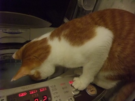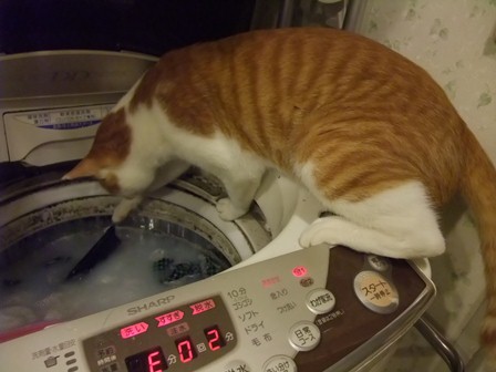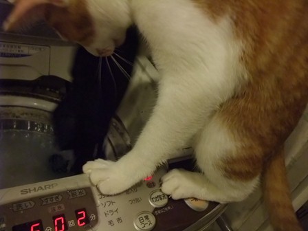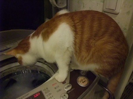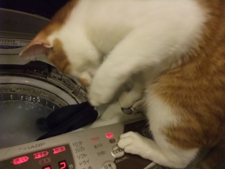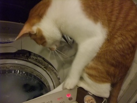 この前は、ズボンをつろうとしてました~ 釣り針みたいなつめはこのためにあったんだ。 金魚がいたら、危ない猫です・・・ |