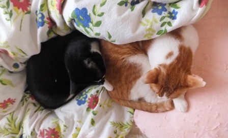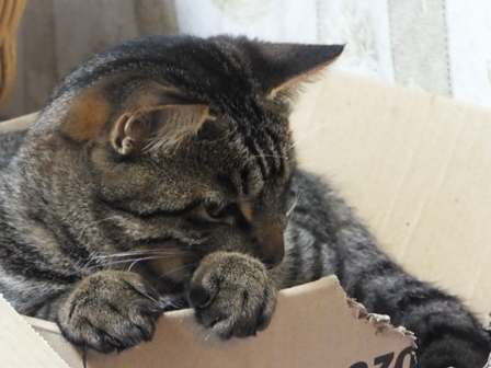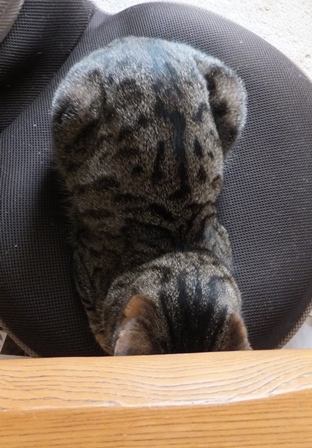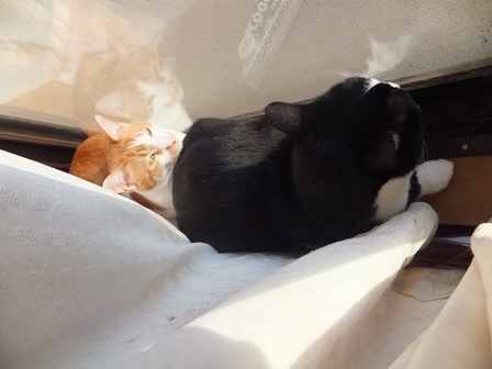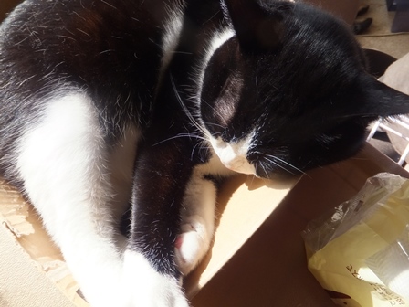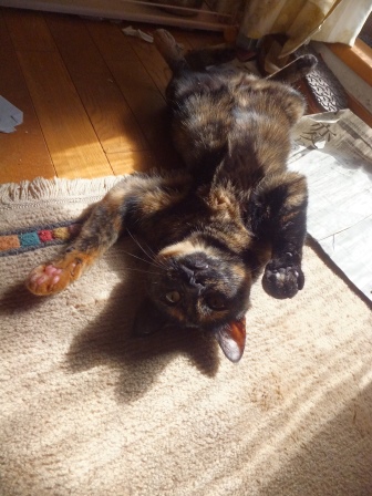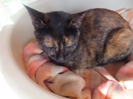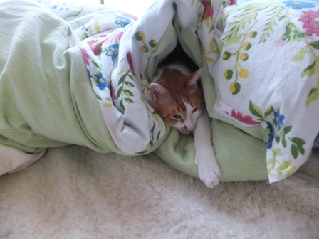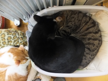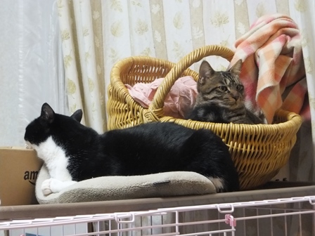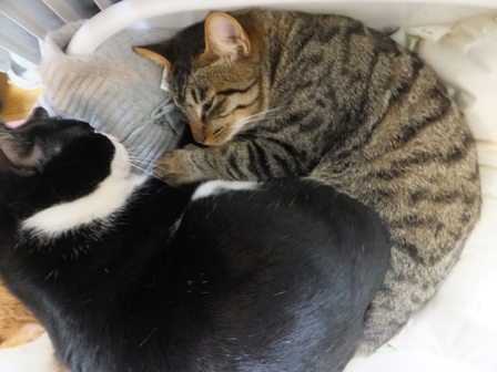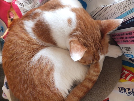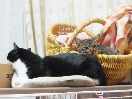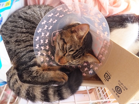 はなちゃんちの屋上は猫でいっぱい 一人が好きな苑子 しまととの席はここ 寒い時は、ぱたぽんママといっしょ ぱたぽんは最近はうっとうしくて、うーとうなりながらもいっしょにねてあげます。 苑子の日光浴~ はなちゃんちの上で、えらそうなしまとと までろんはもぐりこむのが上手 ぱたぽんとまでろんは、仲良しではないけれど、 最初から二匹でいるので、なんとなくなじんでます。 はやくはなちゃんのお部屋がほしい苑子。ベッドも時々借りています。 小さい箱はぴったり感がいいのかも? 火災報知器点検の日の二匹。窓とカーテンの隙間に、電車状に連なっています。 昨日は雨で一日寝ていたけど、今日はお天気だから、やっぱり気持ちよく寝ています~ 先週、しまととは、化繊の糸が舌から腸まで絡まって、腸重積と膵炎のようになり、緊急手術してもらいました。3日ほどえさもたべられず、点滴をしていましたが、4日目に退院して、えりまき生活しています。 退院してきたら、病院くさいし、変なものつけているので、他の猫たちにシャーシャー怒られて、食欲もいまいちでしたが、だんだん食欲魔猫が戻ってきています。食べものじゃないものは、食べちゃだめですー!!!