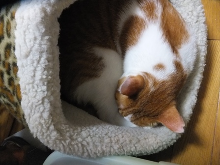 生活クラブのリサイクル市で買った猫のかまくら型ベッドは大人気。